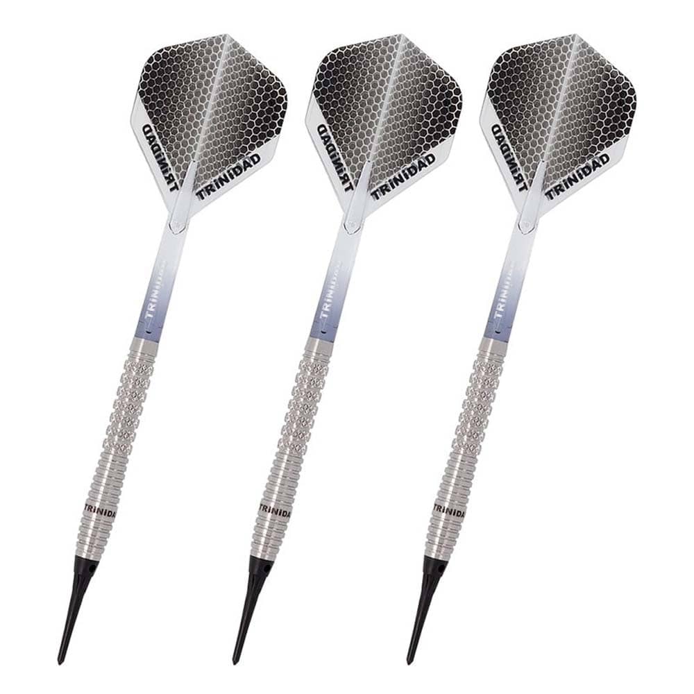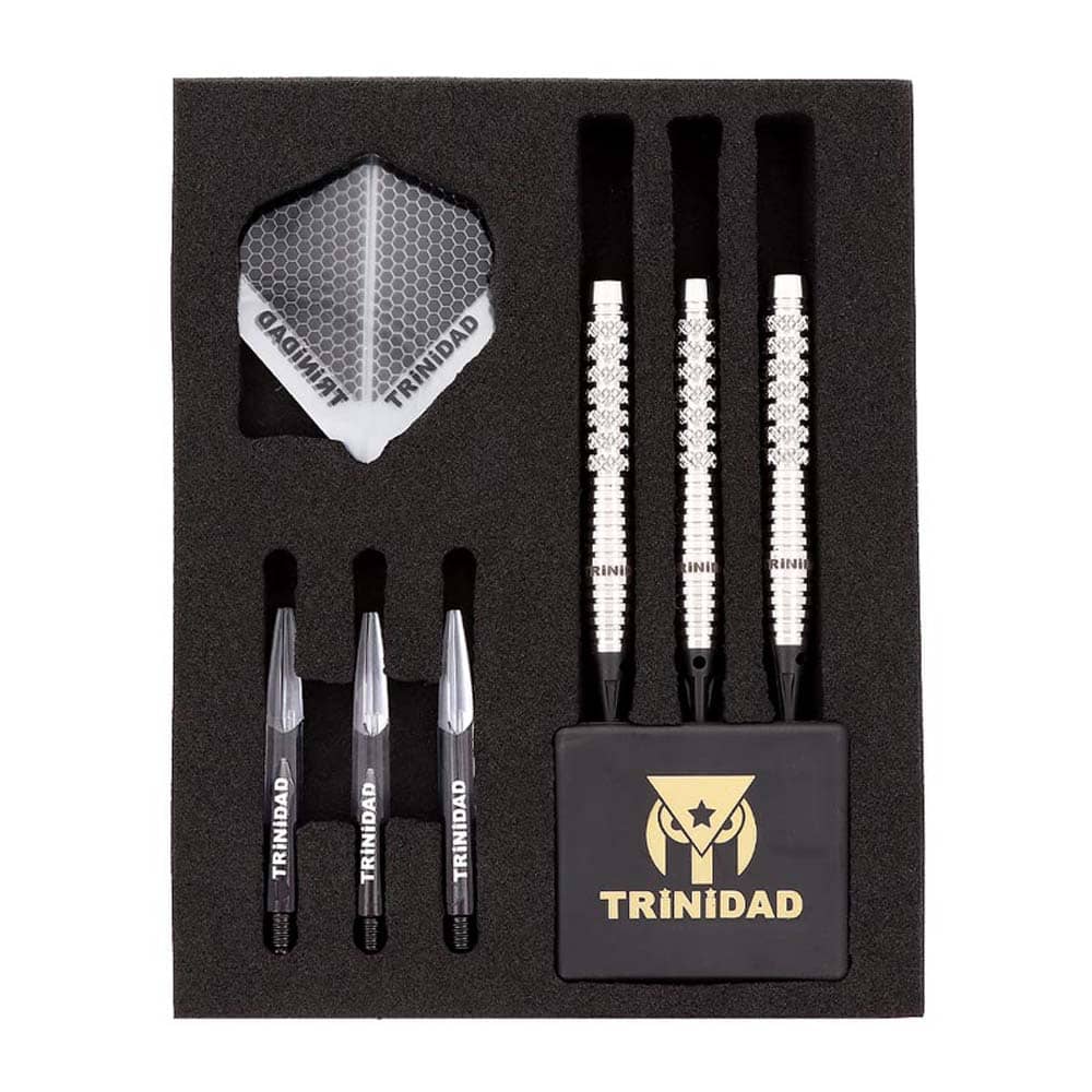 El juego de dardos se compone por 1 set de 3 cuerpos Eder Type5, 1 set de 3 plumas Trinidad 1 set de 3 cañas Trinidad y 3 puntas de plástico 2ba.