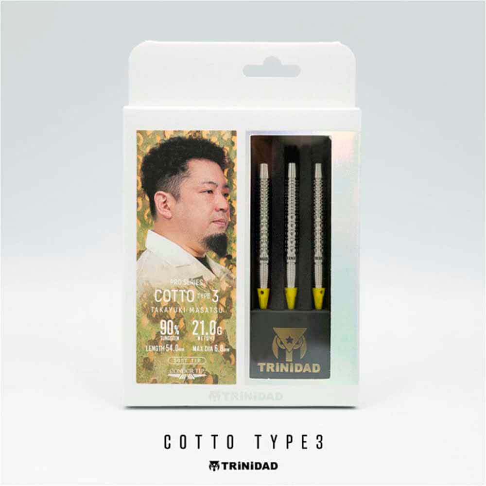 El juego de dardos se compone por 1 set de 3 cuerpos Cotto Type 3 Masatsu Takayuk , 1 set de 3 plumas Trinidad, 1 set de 3 cañas Trinidad y 3 puntas de plástico 2ba.