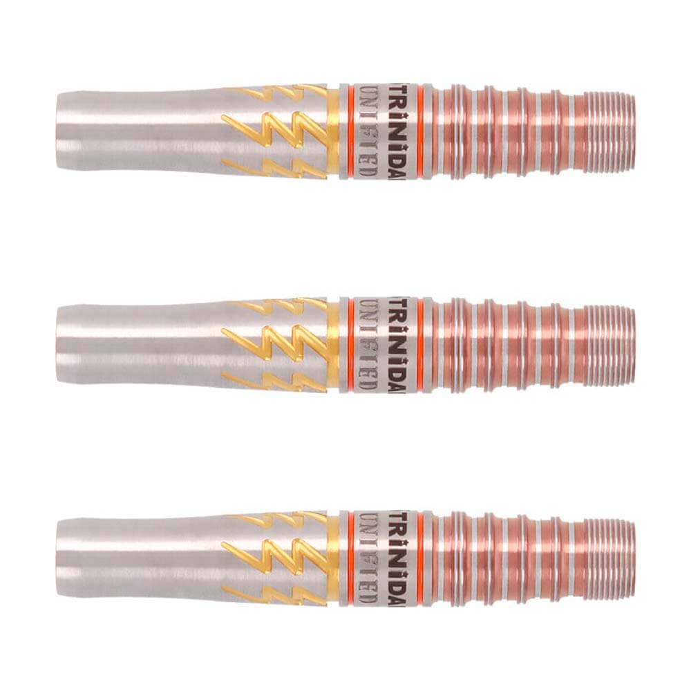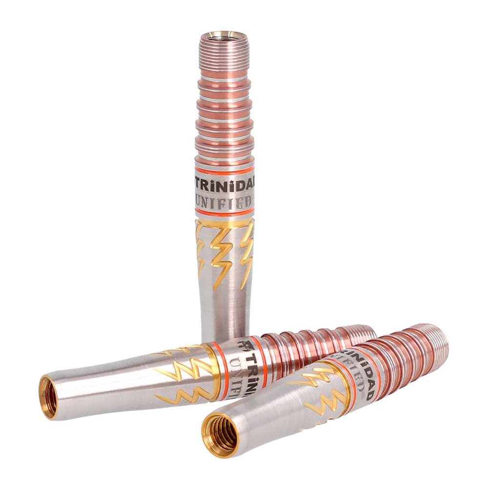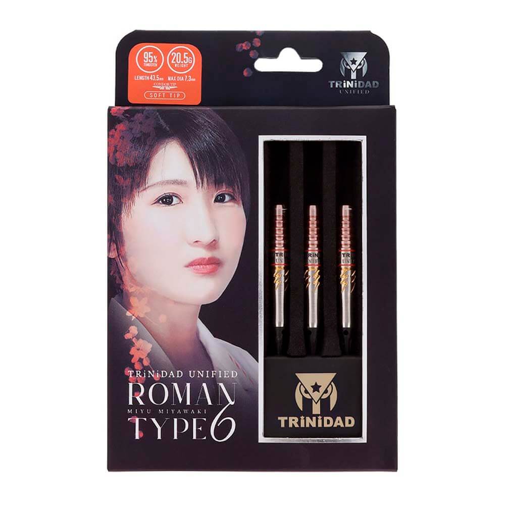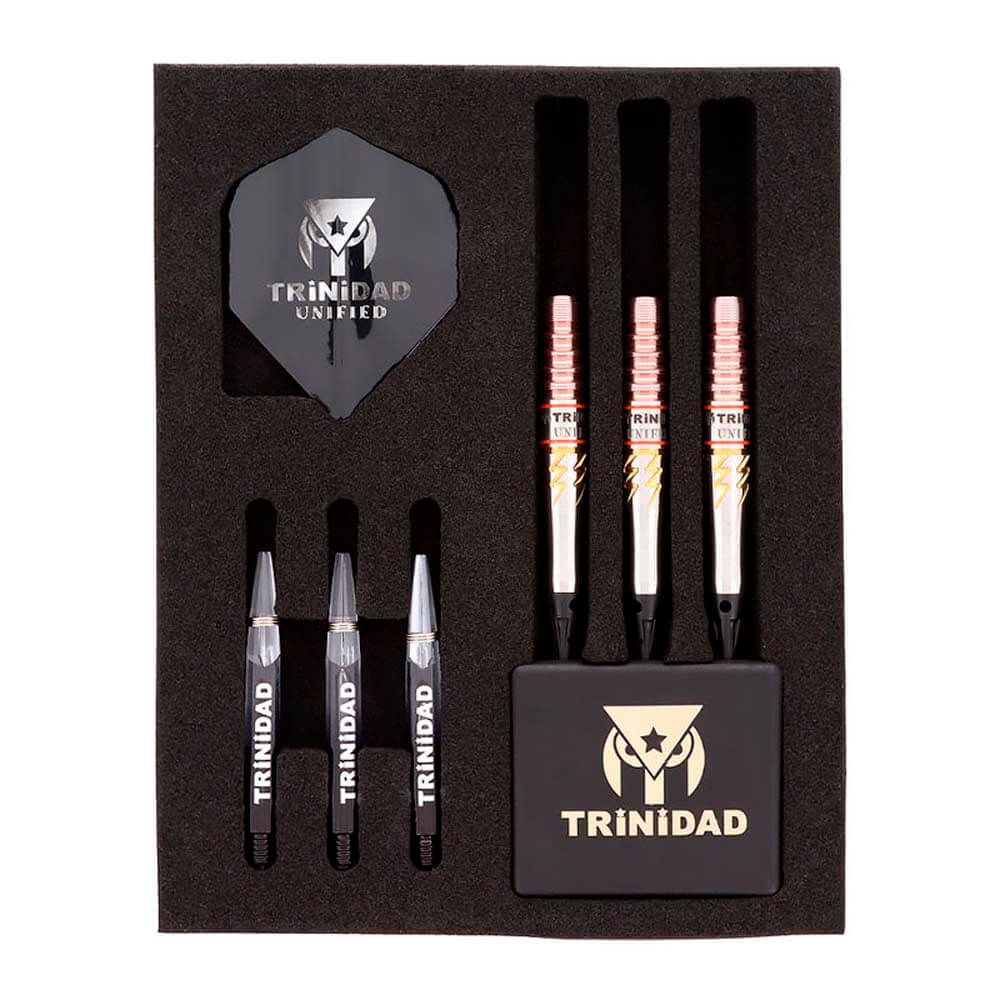El juego de dardos se compone por 1 set de 3 cuerpos Trinidad Roman Type6, 1 set de 3 plumas Trinidad, 1 set de 3 cañas Trinidad y 3 puntas de plástico 2ba.