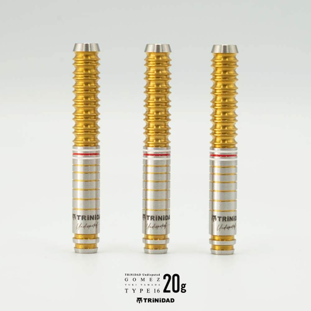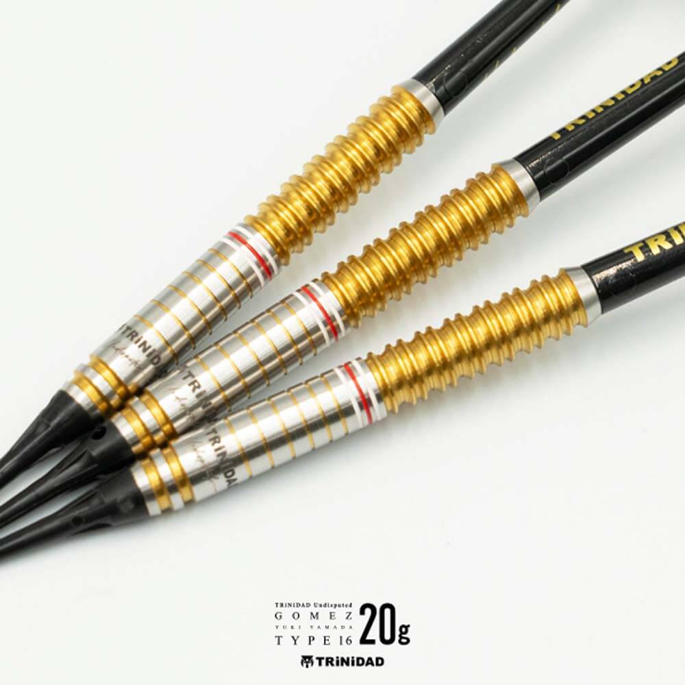 El juego de dardos Trinidad Undisputed Gomez Type 16 se compone por 1 set de 3 cuerpos , 1 set de 3 plumas Trinidad, 1 set de cañas Trinidad y 1 set de 3 puntas de plástico 2ba