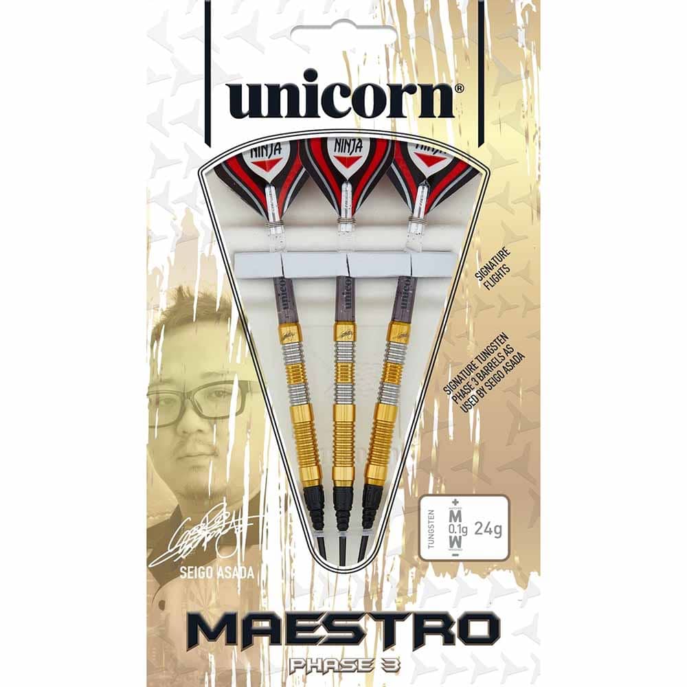 DESCRIPCIÓN:Dardos de gran calidad fabricados por la marca de dardos Unicorn Darts y diseñados por el jugador Unicorn Seigo Asada ahora en su versión Phase 3, esta versión lo que mas resalta de este modelo de dardos es su acabado en color dorado y su agarre anillado que hace del un dardos muy elegante y con un agarre de gran calidad.