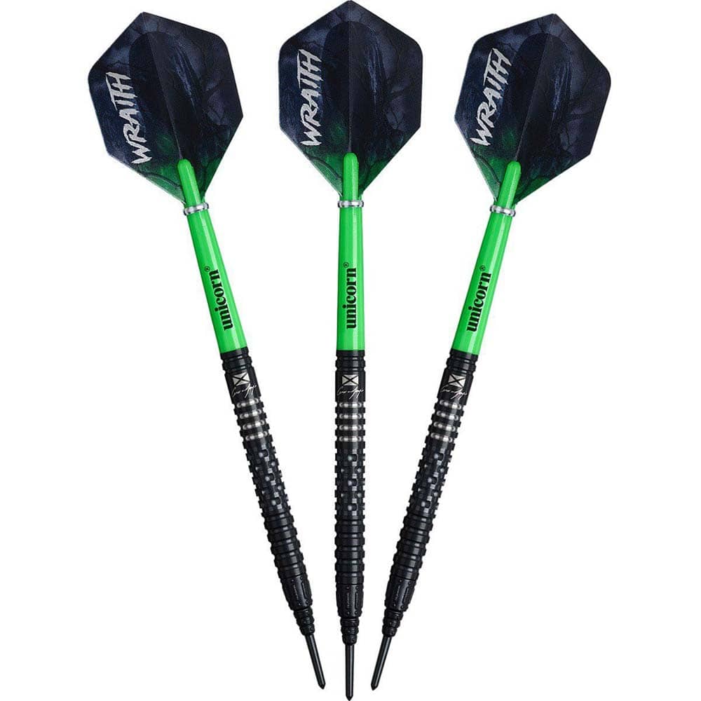 El juego de dardos Unicorn Wraith Cameron Menzies se compone por 1 set de 3 cuerpos, 1 set de 3 cañas Unicorn medium, 1 set de 3 plumas Unicorn y 3 puntas de plástico Unicorn Epic 2ba