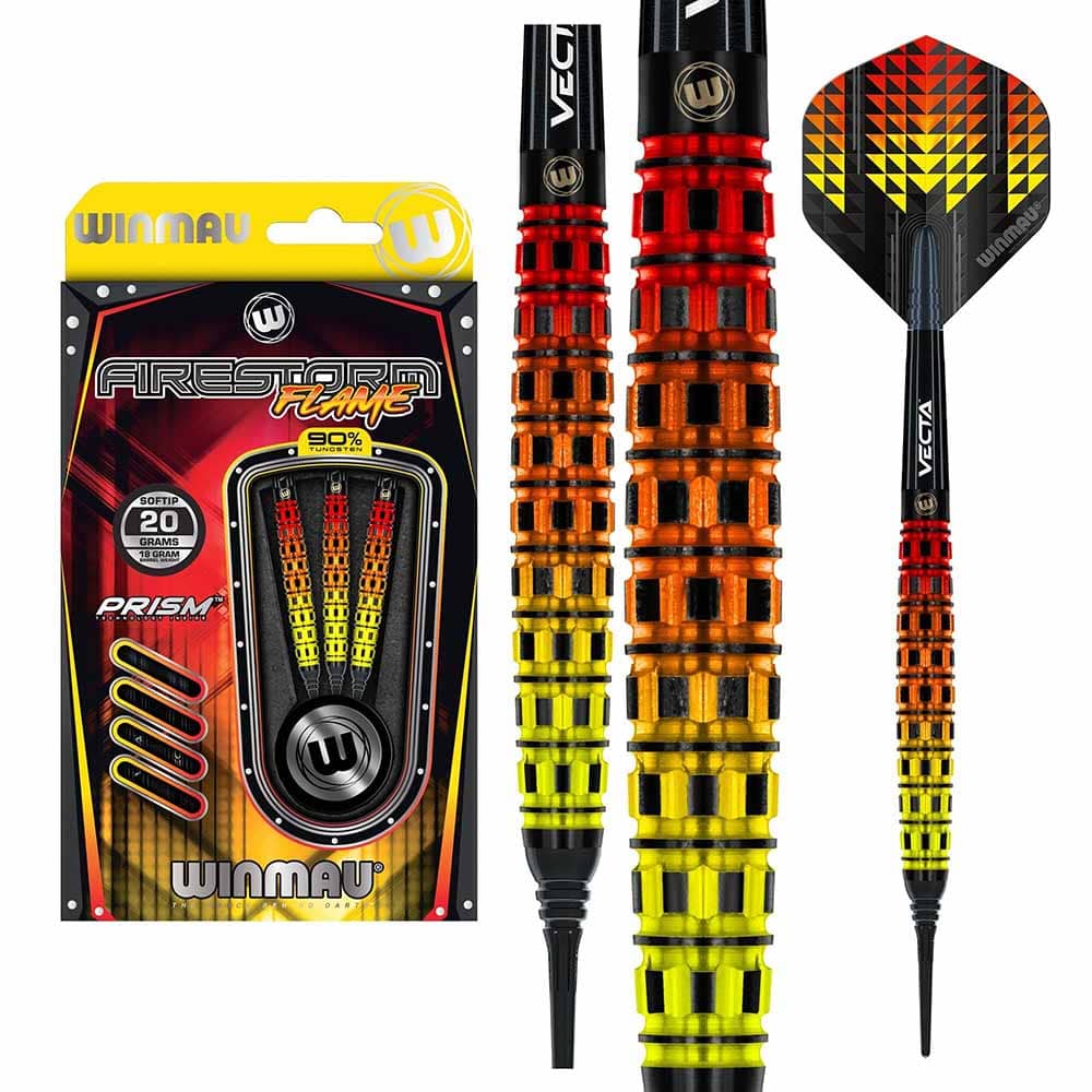 El juego de dardos Winmau Firestrom Flame, se compone por 1 set de 3 cuerpos , 1 set de 3 plumas y 1 set de 3 cañas