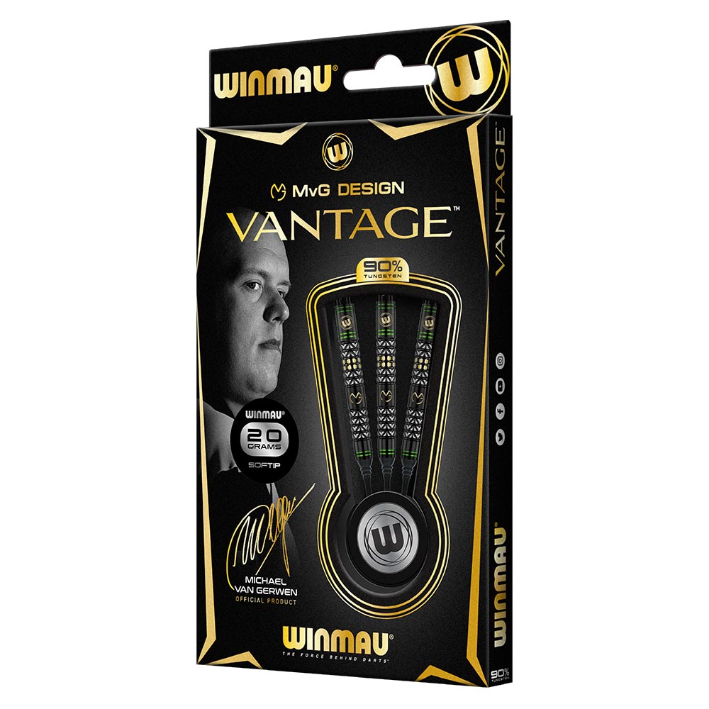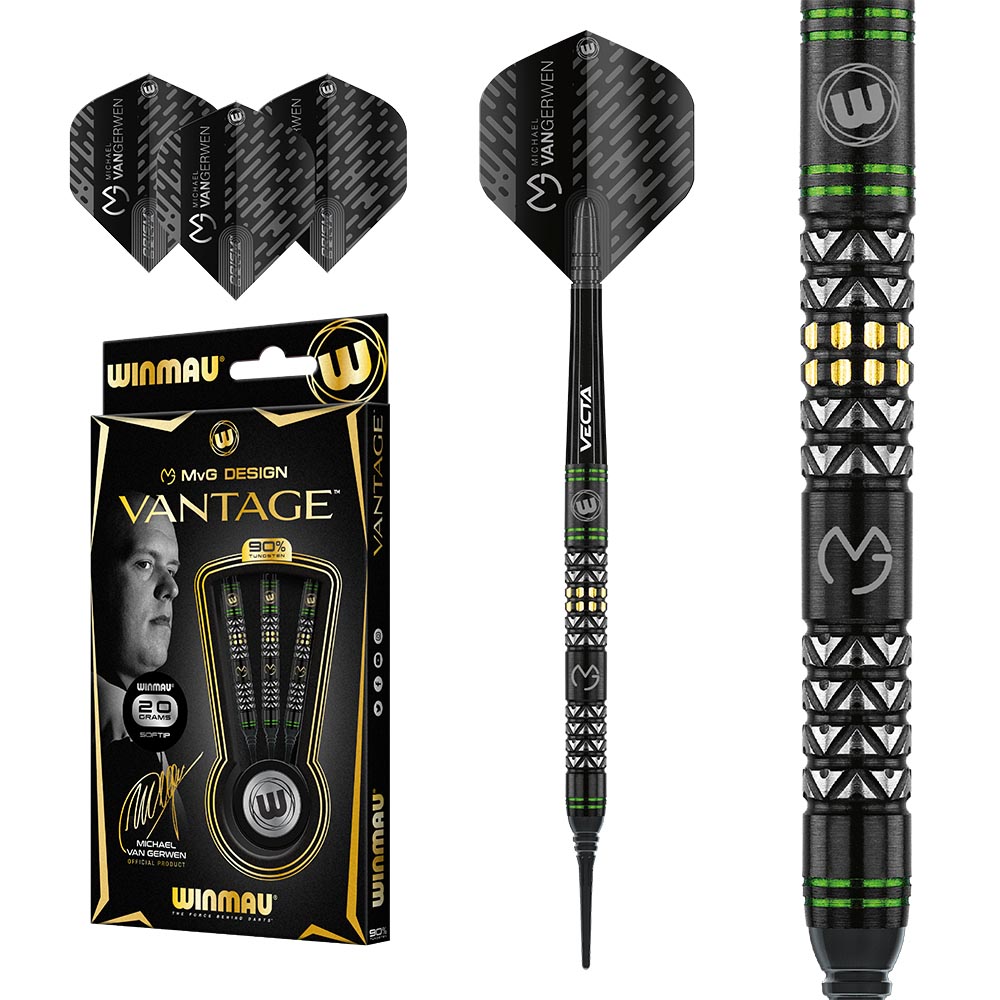 El producto se compone por 1 set de 3 cuerpos Michael Van Gerwen MvG Design Vantage, 1 set de 3 cañas Winmau y 1 set de 3 plumas de la serie MVG