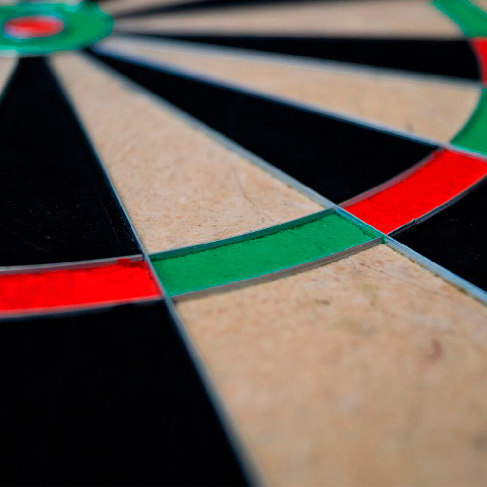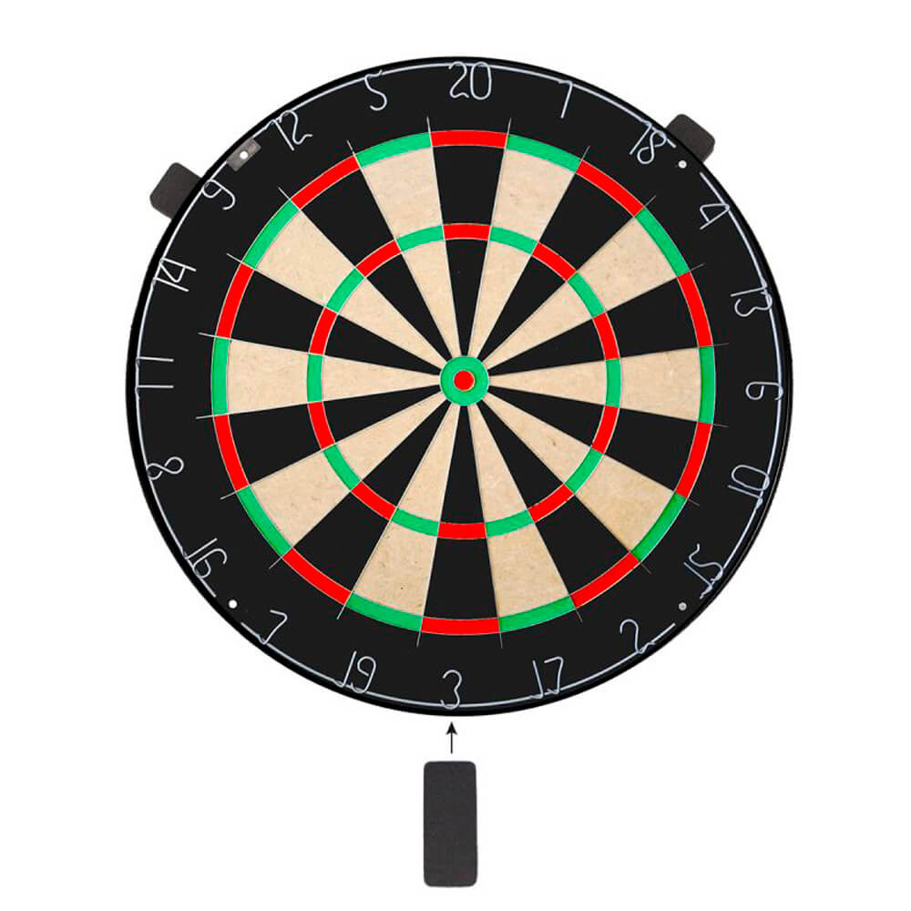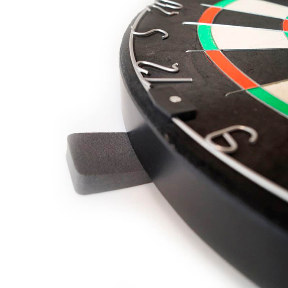 Como el tablero no tiene marcas impresas, se puede girar hasta 10 veces sin afectar la vista. Esto garantiza un desgaste uniforme de la superficie de juego y prolonga significativamente su vida útil. El paquete incluye un soporte de pared y tres cuñas para diana. Estas permiten una mayor sujeción y una alineación perfecta del tablero.