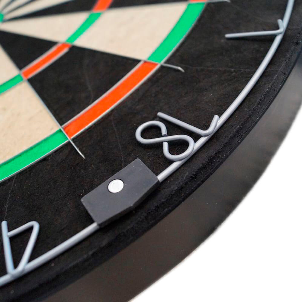 El cableado de acero inoxidable ultrafino y sin grapas garantiza menos rebotes y una superficie de impacto máxima. Como en todas las dianas profesionales, el anillo numérico es giratorio.