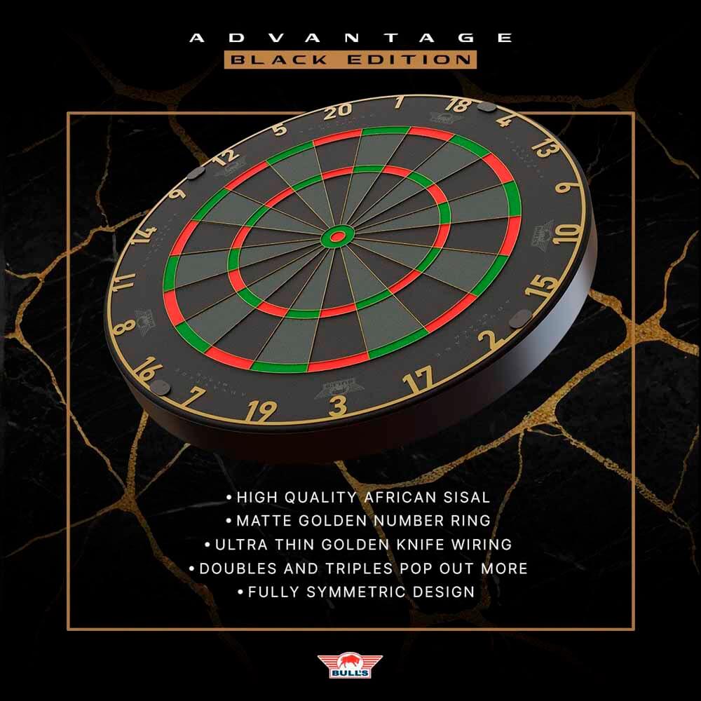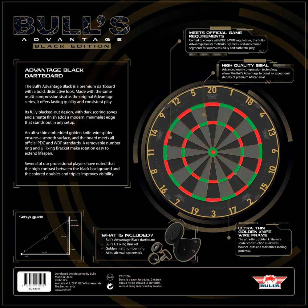 DESCRIPCIÓN:Descubre la diana Bull's Advantage Black, la última evolución en dardos de precisión de Bull's, ahora reinventada con un acabado negro audaz y de alto contraste. Fabricada con sisal africano de primera calidad y elaborada según estándares profesionales, esta diana ofrece la combinación perfecta de durabilidad, claridad y rendimiento.