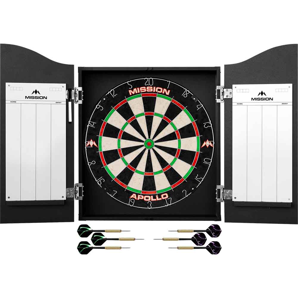 DESCRIPCIÓN:El Mission Home Dart Center ofrece todo lo que necesita para disfrutar de los dardos en casa. El centro consiste en el Gabinete de tablero de dardos de madera Mission en diseño de doble tapa o negro liso clásico, con esquinas reforzadas, bisagras de primera calidad y todas las fijaciones. También se incluye el tablero de dardos Mission Apollo Sisal con diana sin grapas, 2 juegos de dardos de latón completos con ejes y paletas, 2 marcadores de borrado en seco integrados en las puertas del gabinete y 1 marcador de borrado en seco para que esté listo para jugar. Centro de dardos Mission Home - Negro liso. Características: tablero de dardos de alambre redondo Mission Apollo, gabinete de tablero de dardos de alta calidad con bisagras de alta resistencia, paneles de puntuación fáciles de limpiar de 2 lados para el hogar y el visitante, 6 dardos de latón, fijaciones e instrucciones de montaje.