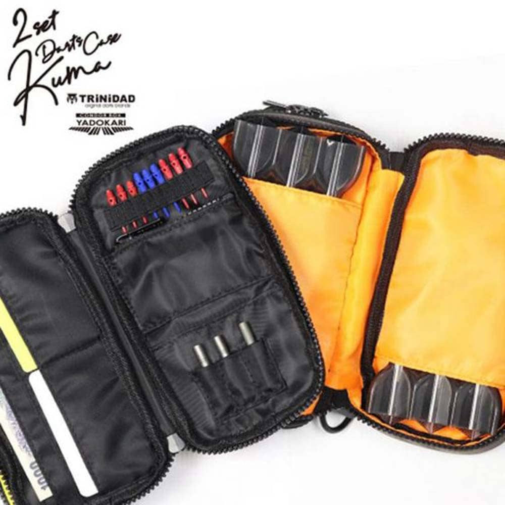 Un práctico estuche con capacidad para dos juegos de dardos completos y accesorios.