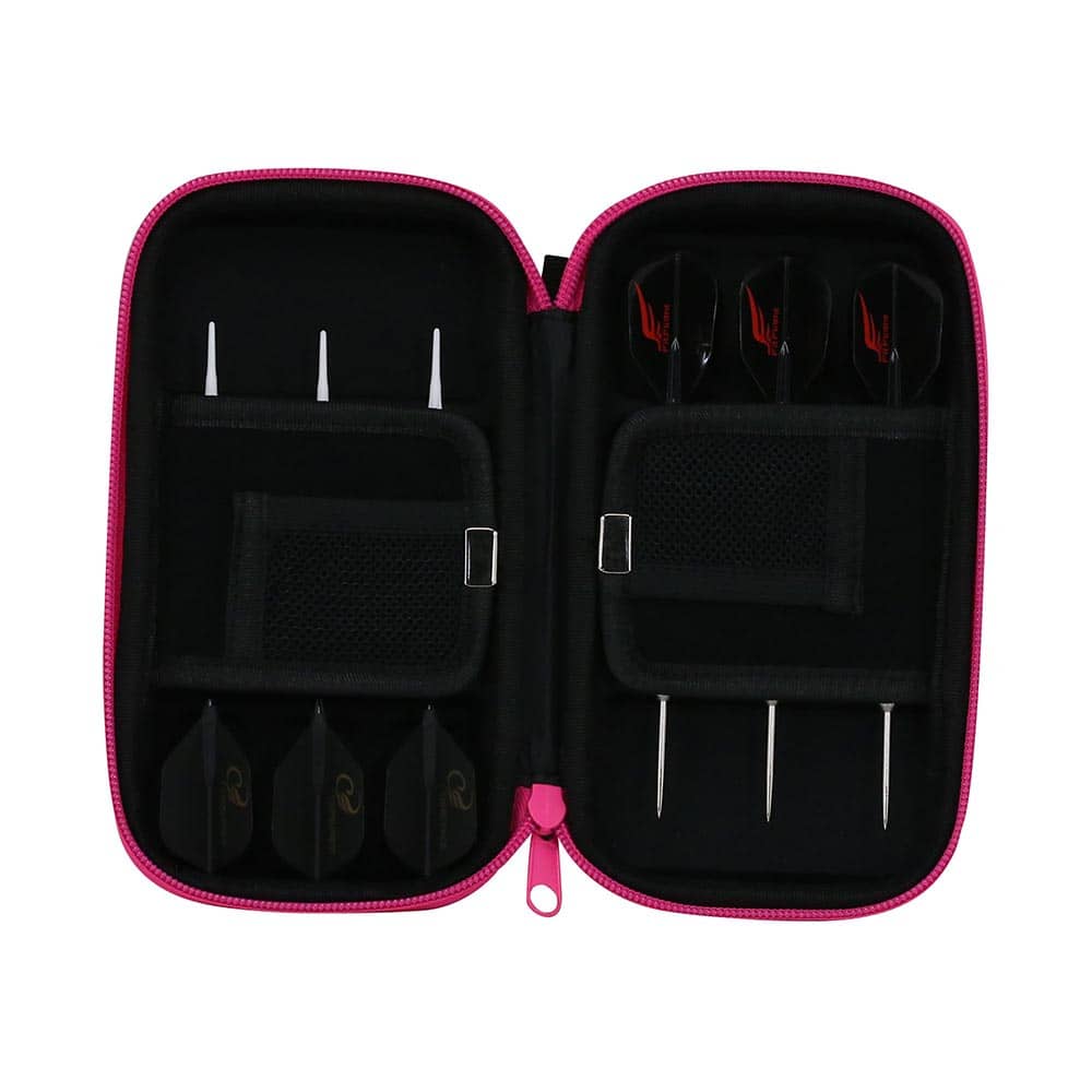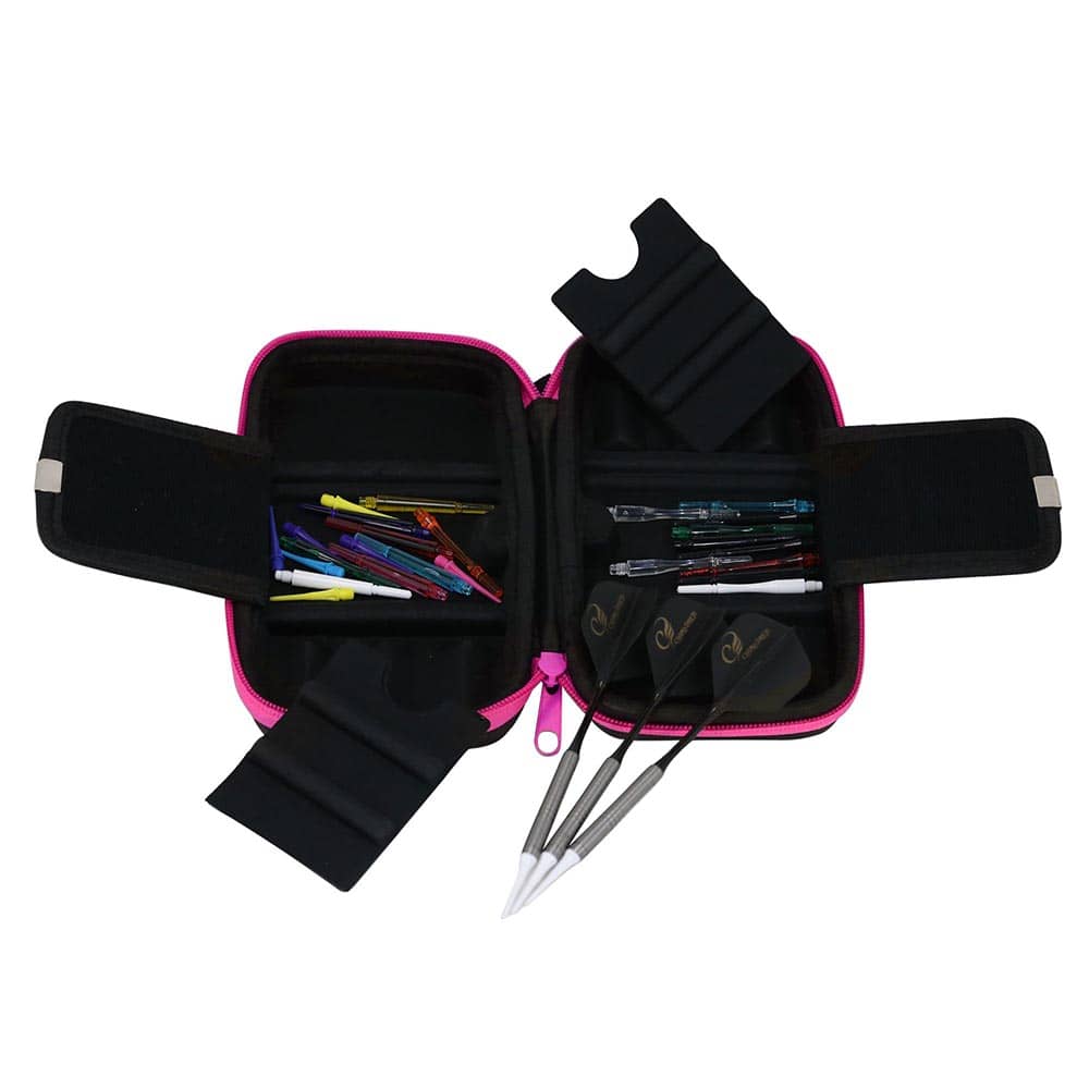 Capacidad de almacenamiento: 2 juegos de dardos completos, 2 tarjetas, plumas, cañas y puntas