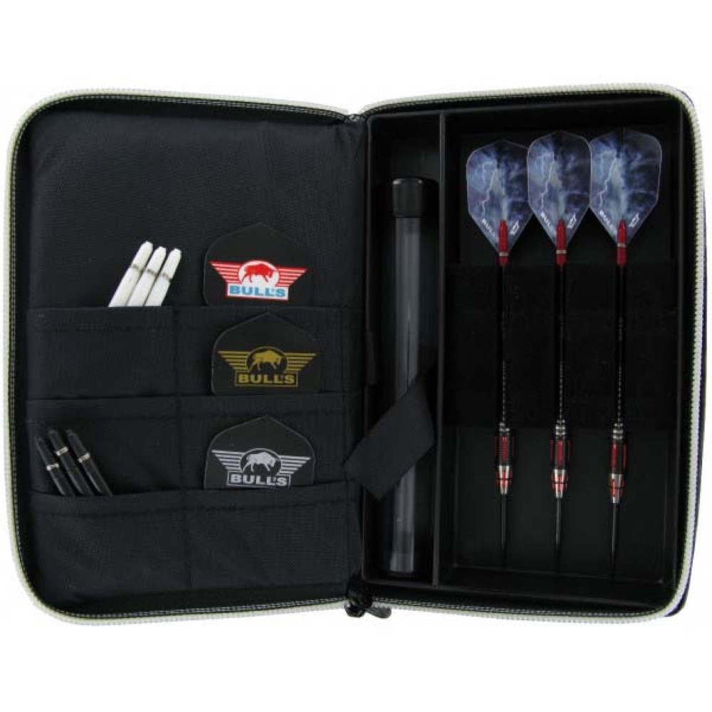 Funda con capacidad para un juego de dardos completo y repuesto.