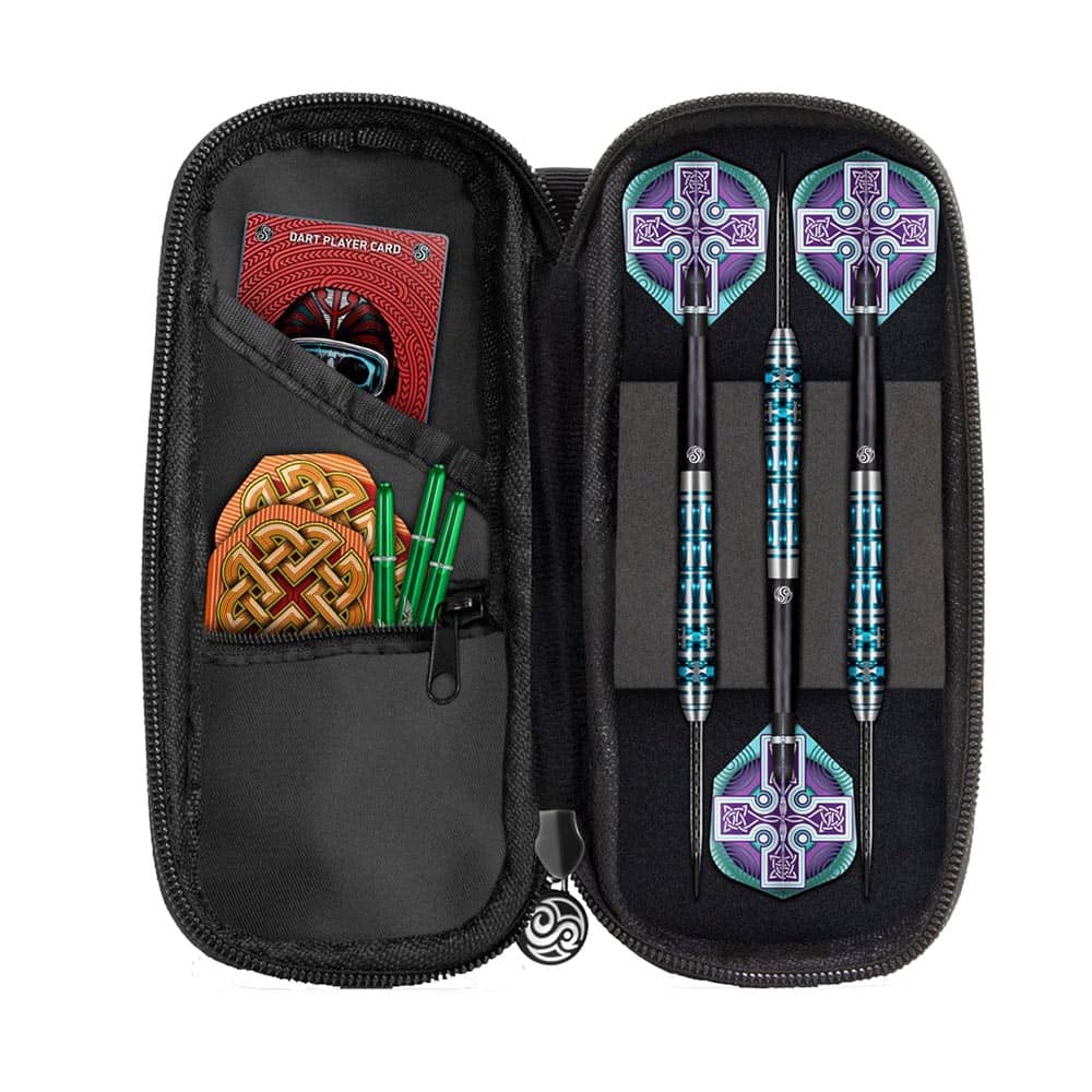 Resistente pero compacta, la funda para dardos Tactical Slim de 18 cm x 8 cm lleva un juego de dardos completamente ensamblados sin aplastarlos. Un cierre de cremallera de calidad abre el estuche como una concha. Un lado tiene espacio para su juego de dardos de punta de plástico o de punta de acero: ideal para torneos o sesiones de dardos en casa de sus amigos. El bolsillo lateral con cremallera se adapta a accesorios como dardos y plumas, y hay espacio para tarjetas y llaves en la manga de arriba. Todo lo que necesites para la competición, manteniendo las manos y los bolsillos libres como un pájaro. Proteja su valioso equipo de dardos mientras viaja: Slim Tactical está disponible en negro, azul o rojo con el diseño tribal de Shot.