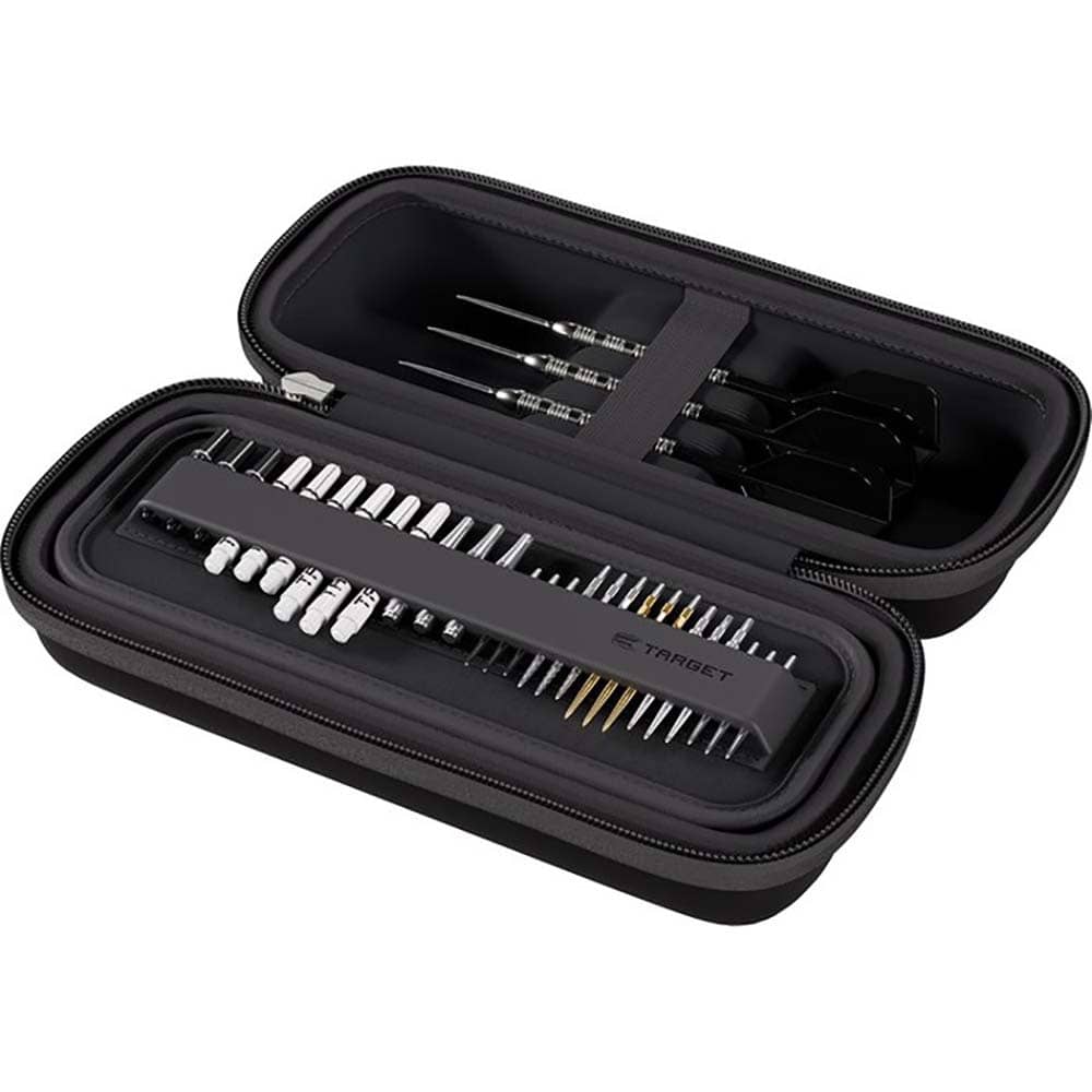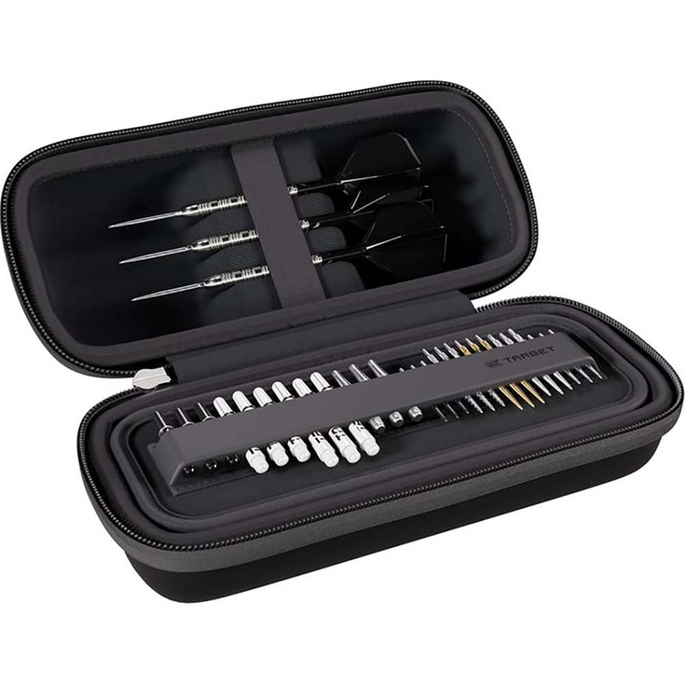 El estuche tiene capacidad para hasta 6 dardos completamente ensamblados, lo que significa que no es necesario desmontarlos entre partidas. Un sistema de bandejas interno ofrece un almacenamiento organizado para 12 cañas de dardos y 15 puntas Swiss Point, mientras que los compartimentos adicionales albergan plumas, accesorios K-Flex, herramientas Swiss Point y otros artículos esenciales.