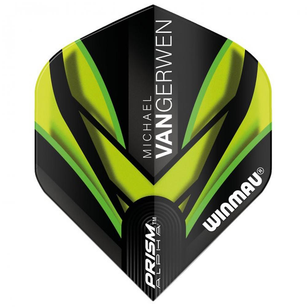 Pluma con diseño Prism Alpha MvG Black Green fabricada por Winmau Darts