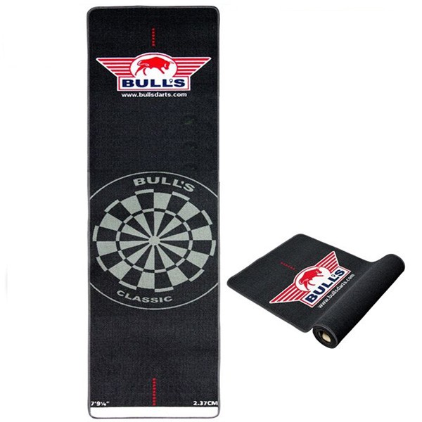 PROTECTOR DE SUELO BULLS. Alfombra de protección para evitar daños en el suelo o en los propios dardos. Incluye la línea de tiro. Color negro. Versátil, ligero, fácil de enrollar y guardar. Diseño moderno con estilo.