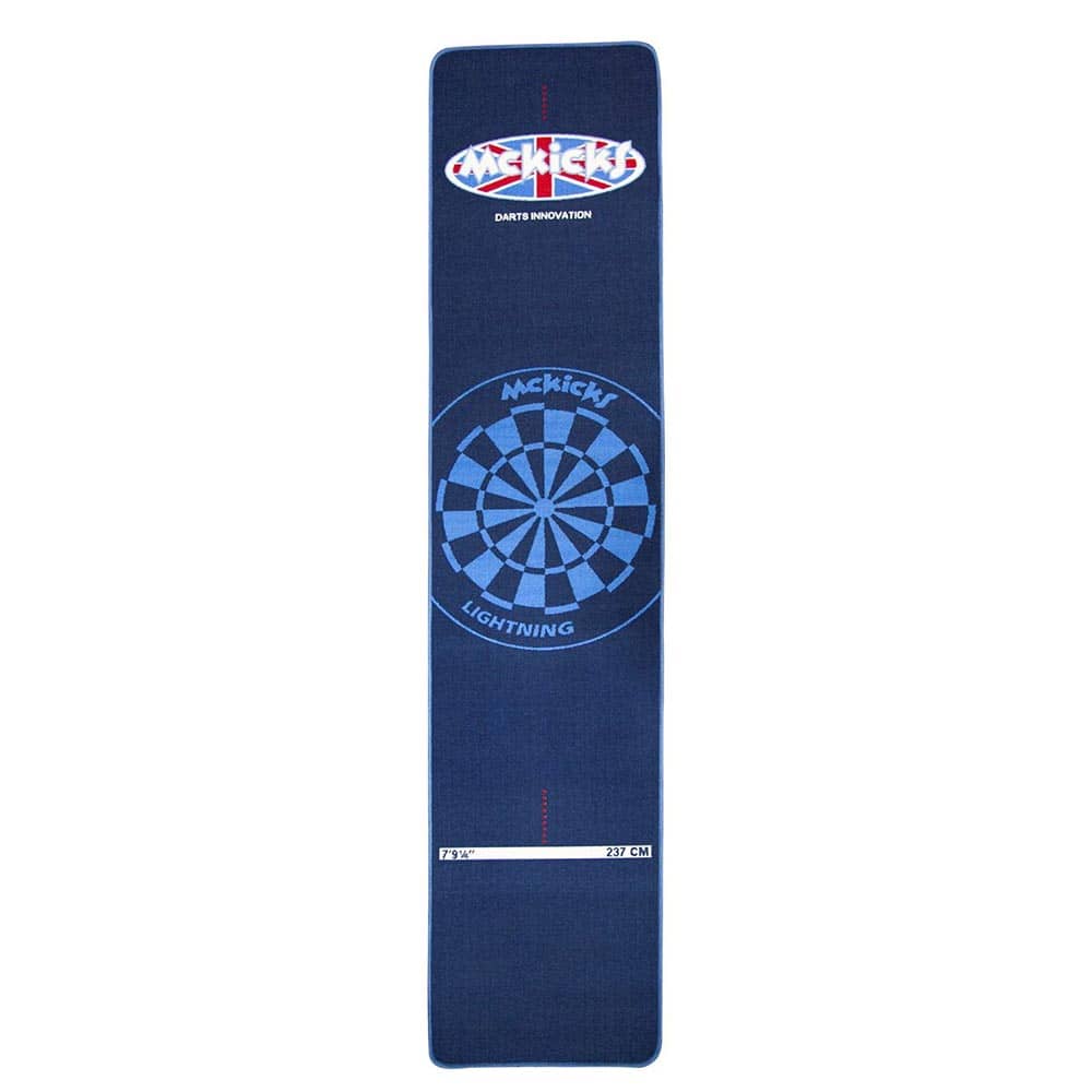 Alfombrilla de dardos de pelo con hilo resistente y línea de tiro impresa con medida oficial. Con logo de la marca McKicks y diana bordada con acabado en azul.