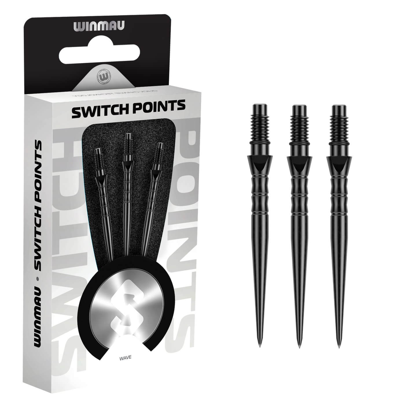 DESCRIPCIÓN:Puntas para dardos con punta de acero fabricadas por Winmau Darts, modelo Switch Point Wave con efecto negro.