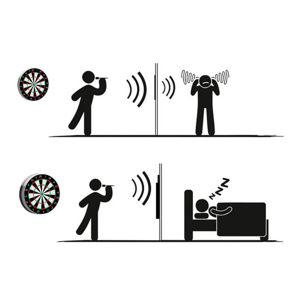 La insonorización Karella de 2 piezas consta de un núcleo de insonorización, en el que se fija la diana de acero, y un anillo de insonorización que lo rodea. Ambas partes están hechas de millones de fibras insonorizantes altamente especializadas. La interacción del núcleo de insonorización y el anillo de insonorización que lo rodea logra un desacoplamiento del ruido casi completo. Cuando el dardo golpea el dardo, el ruido sordo de golpeteo se transmite por la parte posterior de la diana a toda la placa de fibra. En mediciones profesionales, se pudo demostrar una reducción de ruido de más del 80 % en la sala de dardos y las habitaciones adyacentes. Los valores medidos estaban por debajo de 30dB y, por lo tanto, el descanso nocturno reglamentario permanece 100% inalterado.
