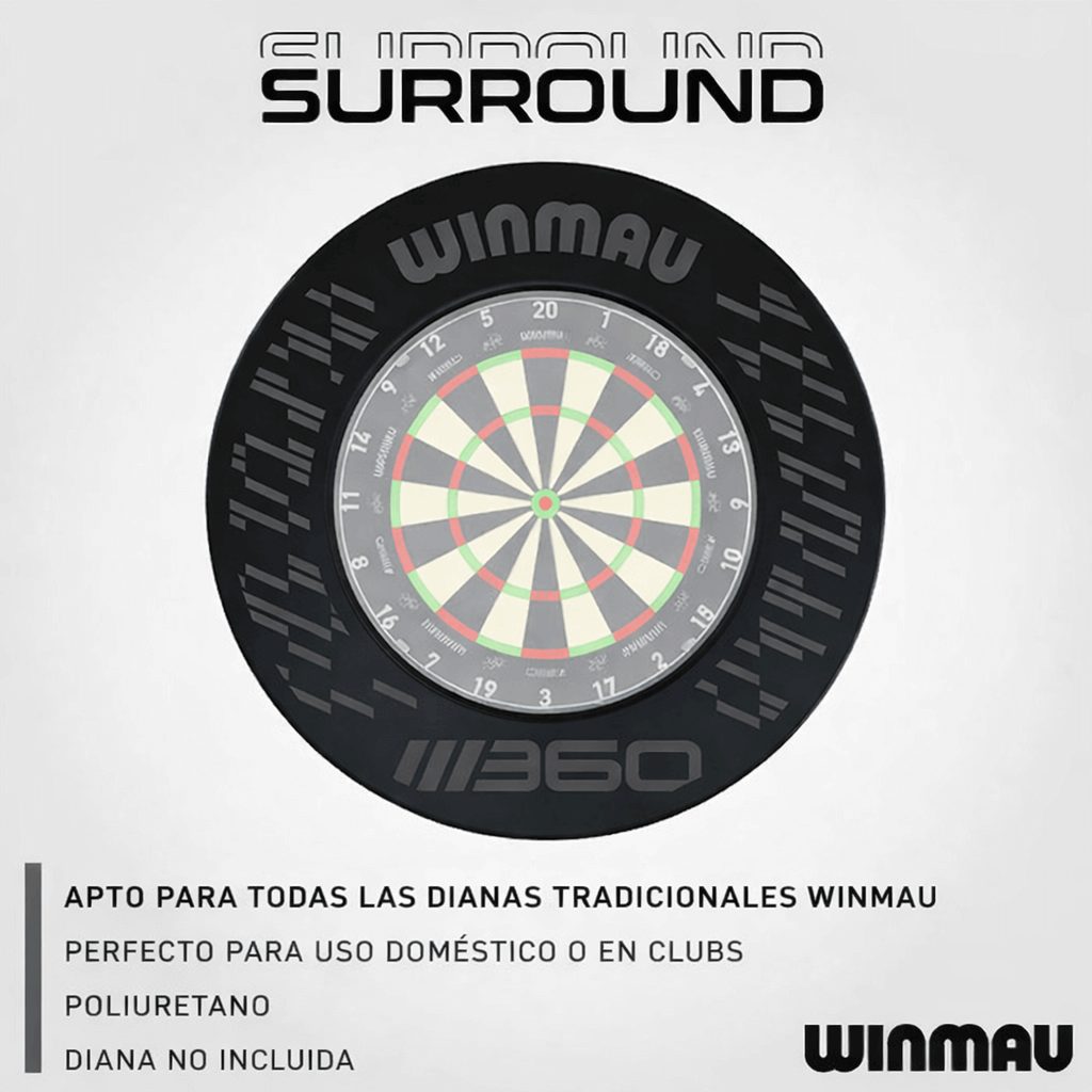 DESCRIPCIÓN:Winmau 360 Black Dart Surround es un protector de diana de una sola pieza fabricado en poliuretano resistente, diseñado para proteger la diana y la pared de dardos fallidos. Compatible con todas las dianas Winmau de fibra (bristle), es ideal tanto para uso doméstico como en clubes. Su diseño negro con detalles grises aporta un estilo moderno y profesional, y su montaje es sencillo. Ofrece una protección eficaz sin interferir en el juego. La diana no está incluida.