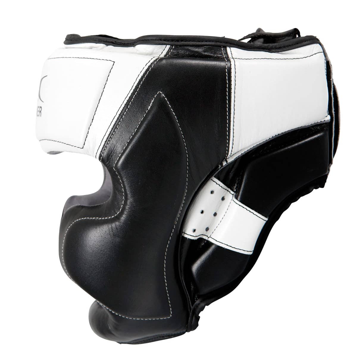 El uso de cuero de vaca de alta calidad garantiza la más alta calidad. La protección para la cabeza está hecha a mano y se puede ajustar al tamaño correcto con un cordón en la parte superior. El amplio cierre de velcro en la parte posterior se puede abrir y cerrar incluso con guantes. El cuero cepillado antideslizante en el interior garantiza un ajuste perfecto incluso en situaciones de entrenamiento extremas. El protector de la barbilla evita que la mandíbula se desprenda durante el entrenamiento cuando se golpea desde abajo y la protege por igual. El recorte facial está diseñado para que todas las situaciones de entrenamiento se puedan reproducir perfectamente.