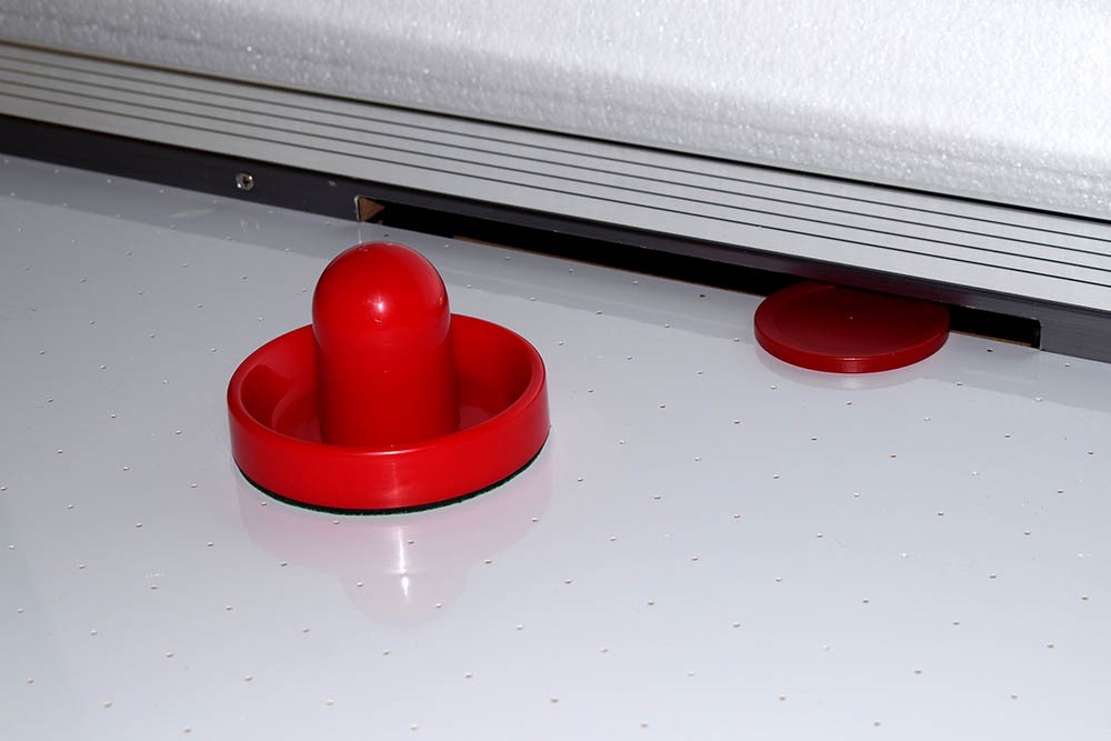 Mesa de air hockey Toronto, 4 pulsadores (rojo, material ABS), 4 discos (rojo, material ABS) e instrucciones de montaje.