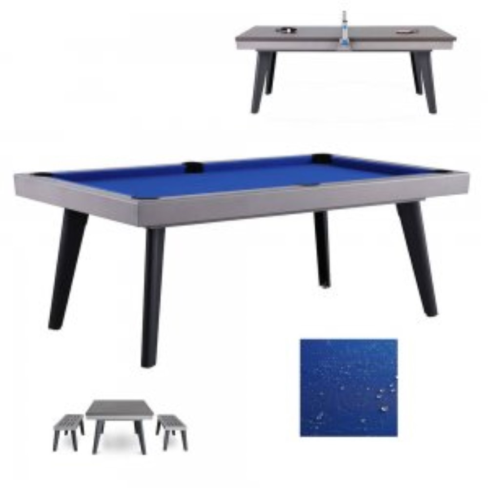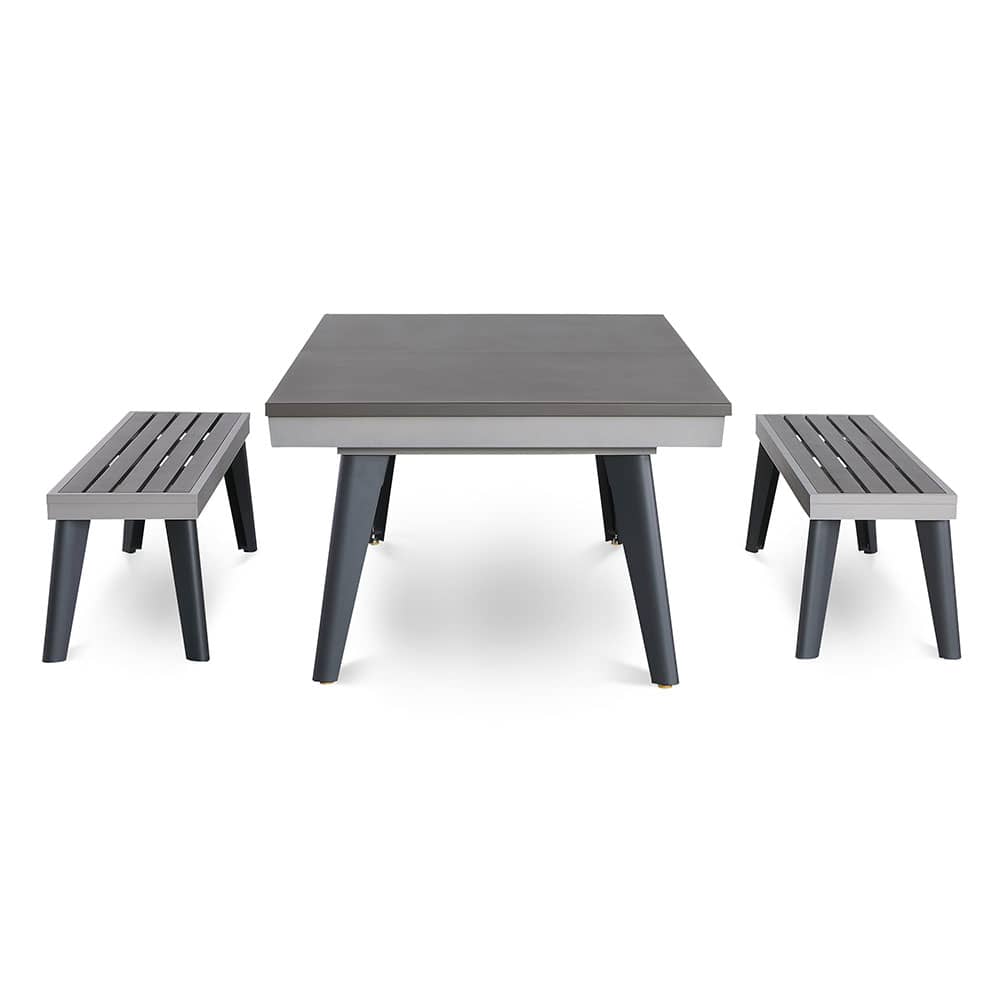 Con la placa de cubierta de 2 partes de color gris oscuro a juego hecha de aluminio, la mesa de billar se puede convertir rápidamente en una mesa de comedor o de trabajo. La construcción delgada del pie brinda mucho espacio para las piernas. Los pies están hechos de metal anodizado negro y tienen pequeños pies ajustables en el extremo del pie para compensar los desniveles del piso. Los bolsillos de bolas de bajo ruido se pueden plegar de manera invisible después del juego.