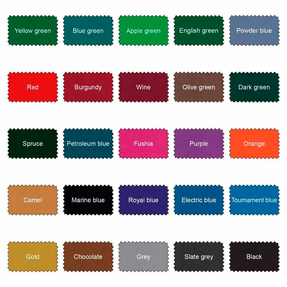 El billar incluye solo la tela los repuestos como bolas, tacos, taquera y tizas hay que comprarlo aparte. El paño tienes la carta de colores en una de las imagenes del producto, añadir el color elegido en comentarios en el carro de la compra.
