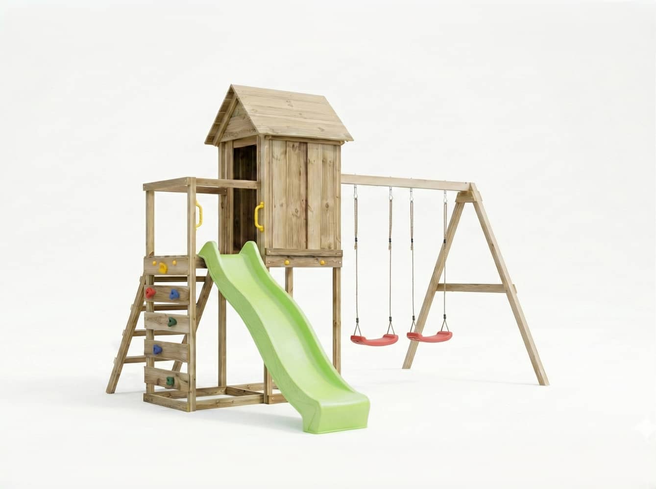 Gaia es un divertido parque infantil fabricado con madera de primera calidad que ofrece horas y horas de juego a tus hijos aunque tengas poco espacio en el jardín. El tratamiento de impregnación hace que toda la estructura sea perfectamente resistente a todas las condiciones climáticas y sea de fácil mantenimiento. Para llegar a la plataforma, los niños pueden subir por las vigas de madera o subir por la escalera . Una vez lleguen podrán bajar por el tobogán de olas. En los dos columpios podrán balancearse alegremente en compañía. También pueden probar suerte en competiciones de escalada subiendo los escalones de la escalera lateral. La certificación EN-71 certifica el total cumplimiento de la normativa europea de seguridad en los parques infantiles, garantizada también por los tapones de rosca redondeados. Se suministra todo lo necesario para montar correctamente la estructura.