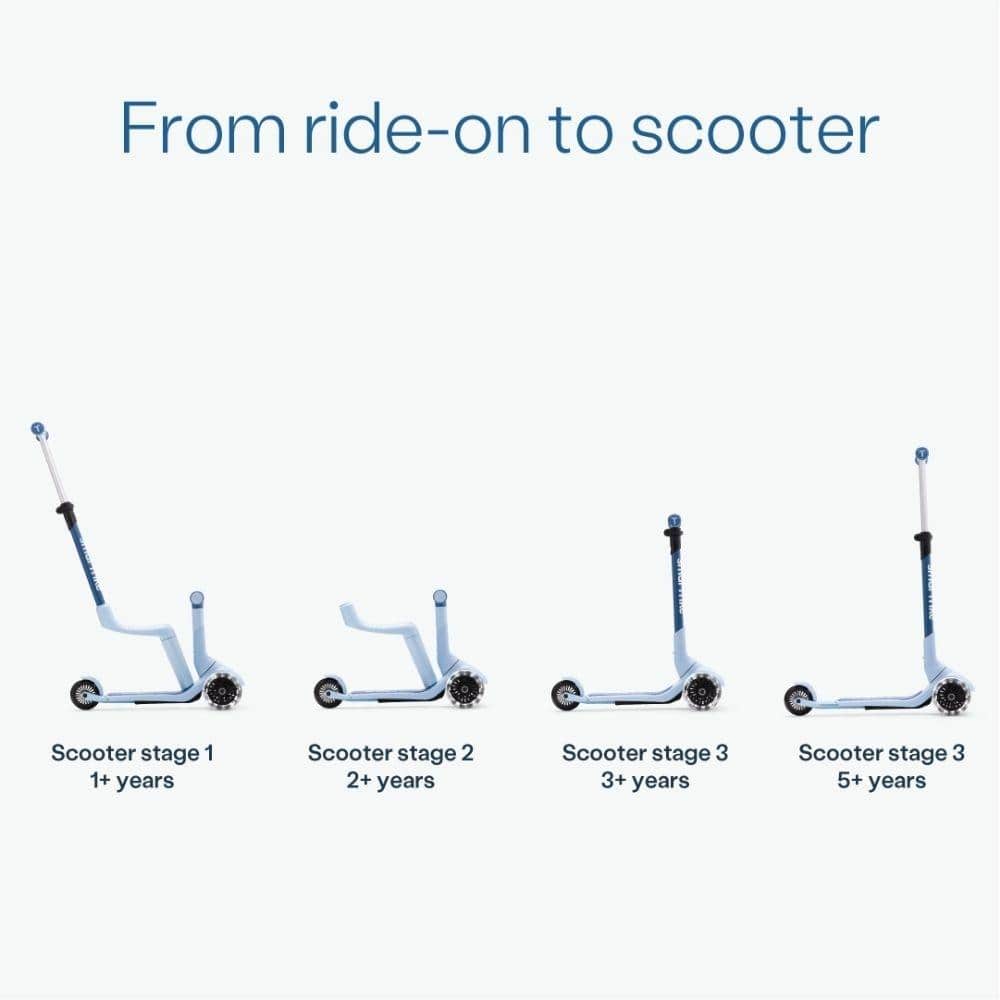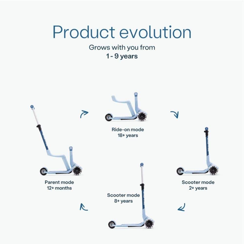 Xtend Scooter Mini Ride es un modelo que se transforma. Pasa de ser un vehículo dirigido por los padres, a convertirse en un correpasillos independiente, y posteriormente en un patinete con base y manillar extensible para niños de hasta 9 años. Este modelo integra un práctico y sencillo asiento con reposapies, para las dos primeras etapas de uso, lo que representa un valor añadido para las familias.